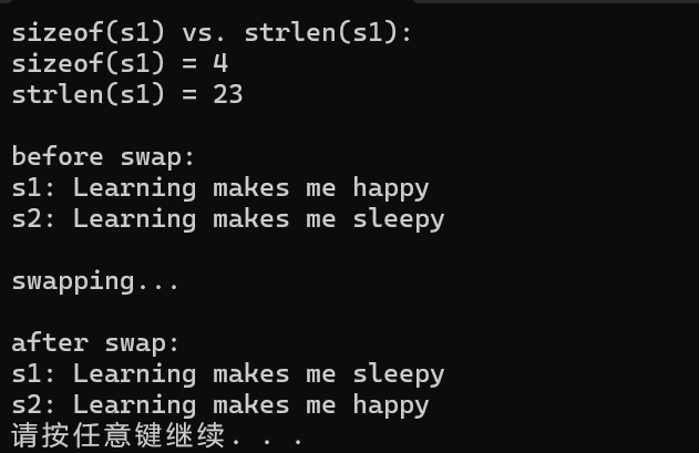 1 #include <stdio.h> 2 #include <string.h> 3 #define N 80 4 5 int main() { 6 char *s1 = "Learning makes me happy"; 7 char *s2 = "Learning makes me sleepy"; 8 char *tmp; 9 10 printf("sizeof(s1) vs. strlen(s1): \n"); 11 printf("sizeof(s1) = %d\n", sizeof(s1)); 12 printf("strlen(s1) = %d\n", strlen(s1)); 13 14 printf("\nbefore swap: \n"); 15 printf("s1: %s\n", s1); 16 printf("s2: %s\n", s2); 17 18 printf("\nswapping...\n"); 19 tmp = s1; 20 s1 = s2; 21 s2 = tmp; 22 23 printf("\nafter swap: \n"); 24 printf("s1: %s\n", s1); 25 printf("s2: %s\n", s2); 26 27 return 0; 28 }