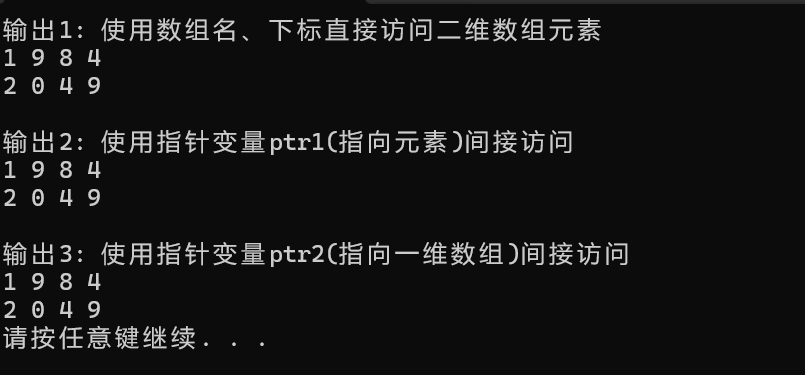 1 #include <stdio.h> 2 3 int main() { 4 int x[2][4] = {{1, 9, 8, 4}, {2, 0, 4, 9}}; 5 int i, j; 6 int *ptr1; // 指针变量,存放int类型数据的地址 7 int(*ptr2)[4]; // 指针变量,指向包含4个int元素的一维数组 8 9 printf("输出1: 使用数组名、下标直接访问二维数组元素\n"); 10 for (i = 0; i < 2; ++i) { 11 for (j = 0; j < 4; ++j) 12 printf("%d ", x[i][j]); 13 printf("\n"); 14 } 15 16 printf("\n输出2: 使用指针变量ptr1(指向元素)间接访问\n"); 17 for (ptr1 = &x[0][0], i = 0; ptr1 < &x[0][0] + 8; ++ptr1, ++i) { 18 printf("%d ", *ptr1); 19 20 if ((i + 1) % 4 == 0) 21 printf("\n"); 22 } 23 24 printf("\n输出3: 使用指针变量ptr2(指向一维数组)间接访问\n"); 25 for (ptr2 = x; ptr2 < x + 2; ++ptr2) { 26 for (j = 0; j < 4; ++j) 27 printf("%d ", *(*ptr2 + j)); 28 printf("\n"); 29 } 30 31 return 0; 32 }