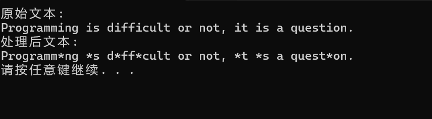 1 #include <stdio.h> 2 #define N 80 3 4 void replace(char *str, char old_char, char new_char); // 函数声明 5 6 int main() { 7 char text[N] = "Programming is difficult or not, it is a question."; 8 9 printf("原始文本: \n"); 10 printf("%s\n", text); 11 12 replace(text, 'i', '*'); // 函数调用 注意字符形参写法,单引号不能少 13 14 printf("处理后文本: \n"); 15 printf("%s\n", text); 16 17 return 0; 18 } 19 20 // 函数定义 21 void replace(char *str, char old_char, char new_char) { 22 int i; 23 24 while(*str) { 25 if(*str == old_char) 26 *str = new_char; 27 str++; 28 } 29 }