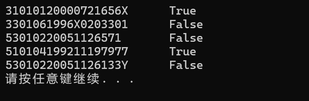 1 #include <stdio.h> 2 #include <string.h> 3 #include <stdlib.h> 4 #define N 5 5 6 int check_id(char *str); // 函数声明 7 8 int main() 9 { 10 char *pid[N] = {"31010120000721656X", 11 "3301061996X0203301", 12 "53010220051126571", 13 "510104199211197977", 14 "53010220051126133Y"}; 15 int i; 16 17 for (i = 0; i < N; ++i) 18 if (check_id(pid[i])) // 函数调用 19 printf("%s\tTrue\n", pid[i]); 20 else 21 printf("%s\tFalse\n", pid[i]); 22 system("pause"); 23 return 0; 24 } 25 26 // 函数定义 27 // 功能: 检查指针str指向的身份证号码串形式上是否合法 28 // 形式合法,返回1,否则,返回0 29 int check_id(char *str) { 30 int j; 31 int l; 32 l=strlen(str); 33 if(l==18){ 34 for(j=0;j<=17;j++){ 35 if(str[j]<='9'&&str[j]>='0') 36 continue; 37 else break; 38 } 39 if(j==17){ 40 if((str[j]>='0'&&str[j]<='9')||str[j]=='X') 41 return 1; 42 else return 0;} 43 } 44 else return 0; 45 }