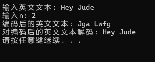1 #include <stdio.h> 2 #define N 80 3 void encoder(char *str, int n); // 函数声明 4 void decoder(char *str, int n); // 函数声明 5 6 int main() { 7 char words[N]; 8 int n; 9 10 printf("输入英文文本: "); 11 gets(words); 12 13 printf("输入n: "); 14 scanf("%d", &n); 15 16 printf("编码后的英文文本: "); 17 encoder(words, n); // 函数调用 18 printf("%s\n", words); 19 20 printf("对编码后的英文文本解码: "); 21 decoder(words, n); // 函数调用 22 printf("%s\n", words); 23 24 return 0; 25 } 26 27 /*函数定义 28 功能:对s指向的字符串进行编码处理 29 编码规则: 30 对于a~z或A~Z之间的字母字符,用其后第n个字符替换; 其它非字母字符,保持不变 31 */ 32 void encoder(char *str, int n) { 33 while (*str != '\0') { 34 if (*str >= 'a' && *str <= 'z') { 35 *str = 'a' + (*str - 'a' + n) % 26; 36 } else if (*str >= 'A' && *str <= 'Z') { 37 *str = 'A' + (*str - 'A' + n) % 26; 38 } 39 str++; 40 } 41 }