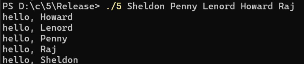 1 #include <stdio.h> 2 #include<string.h> 3 4 void compare(int argc, char *argv[]); 5 6 int main(int argc, char *argv[]) { 7 8 int i; 9 compare(argc, argv); 10 11 for(i = 1; i < argc; ++i) 12 printf("hello, %s\n", argv[i]); 13 14 return 0; 15 } 16 17 void compare(int argc, char *argv[]) 18 { 19 int i,j; 20 char *temp; 21 for(j = 1; j < argc; j++) 22 { 23 for(i = 1; i < argc - j; i++) 24 { 25 if(strcmp(argv[i], argv[i+1]) > 0) 26 { 27 temp = argv[i]; 28 argv[i] = argv[i+1]; 29 argv[i+1] = temp; 30 } 31 } 32 } 33 }