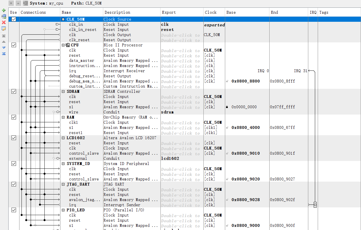为节约时间,Qsys中系统的搭建就不啰嗦了,直接贴图。