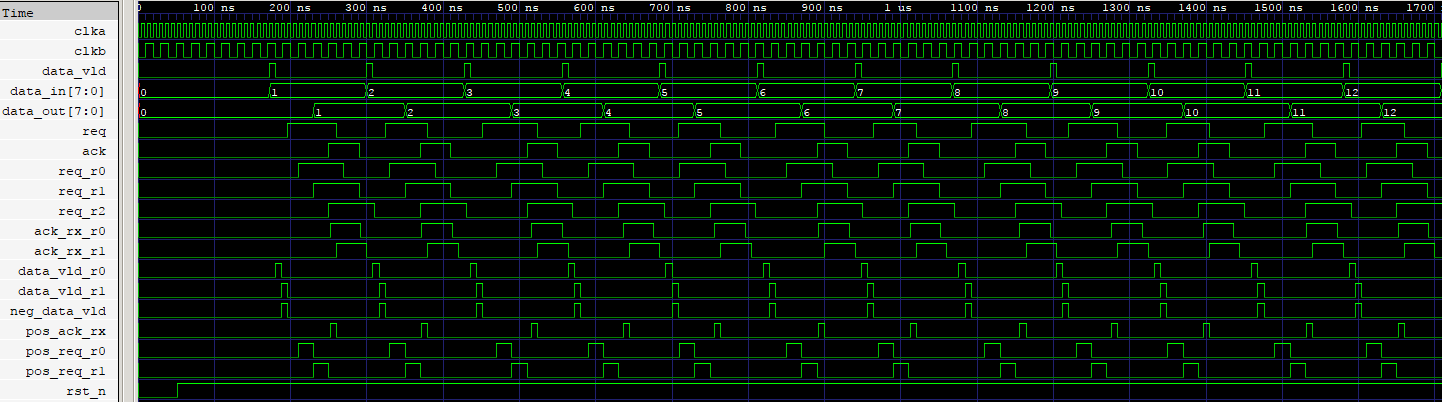 (1)在高频时钟域下,将一个需要发送的数据准备好,将req信号设置为有效。在低频时钟域下,接收端同步该req信号,同步后的信号命名为req_r0、req_r1;