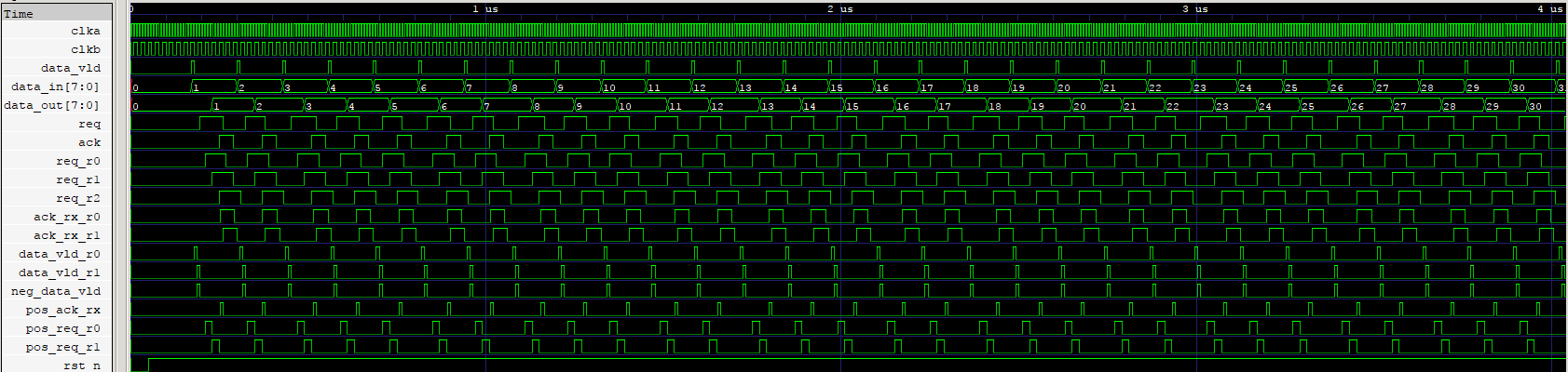 1 module hand_shake( 2 input clka , // fast clock 3 input clkb , // slow clock 4 5 input rst_n , 6 7 input data_vld , // 持续一个时钟周期 8 input [7:0] data_in , 9 10 output reg [7:0] data_out 11 ); 12 13 //========================================================================\ 14 // =========== Define Parameter and Internal signals =========== 15 //========================================================================/ 16 17 reg data_vld_r0 ; 18 reg data_vld_r1 ; 19 20 wire neg_data_vld ; 21 22 reg req ; 23 reg ack ; 24 25 reg ack_rx_r0 ; 26 reg ack_rx_r1 ; 27 28 wire pos_ack_rx ; 29 30 reg req_r0 ; 31 reg req_r1 ; 32 reg req_r2 ; 33 34 wire pos_req_r0 ; 35 wire pos_req_r1 ; 36 37 //============================================================================= 38 //**************************** Main Code ******************************* 39 //============================================================================= 40 41 always @(posedge clka or negedge rst_n) begin 42 if(!rst_n) begin 43 data_vld_r0 <= 1'b0; 44 data_vld_r1 <= 1'b0; 45 end 46 else begin 47 data_vld_r0 <= data_vld; 48 data_vld_r1 <= data_vld_r0; 49 end 50 end 51 52 assign neg_data_vld = (data_vld_r1 == 1'b1) && (data_vld_r0 == 1'b0); 53 54 always @(posedge clka or negedge rst_n) begin // 将ack信号同步到clka时钟下 55 if(!rst_n) begin 56 ack_rx_r0 <= 1'b0; 57 ack_rx_r1 <= 1'b0; 58 end 59 else begin 60 ack_rx_r0 <= ack; 61 ack_rx_r1 <= ack_rx_r0; 62 end 63 end 64 65 assign pos_ack_rx = (ack_rx_r1 == 1'b0) && (ack_rx_r0 == 1'b1); 66 67 always @(posedge clka or negedge rst_n) begin // 请求信号设计 68 if(!rst_n) 69 req <= 1'b0; 70 else if(neg_data_vld == 1'b1) 71 req <= 1'b1; 72 else if(pos_ack_rx == 1'b1) 73 req <= 1'b0; 74 else 75 req <= req; 76 end 77 78 // ================ 接收数据部分设计 ============================== 79 80 always @(posedge clkb or negedge rst_n) begin // 在时钟域clkb下同步req信号 81 if(!rst_n) begin 82 req_r0 <= 1'b0; 83 req_r1 <= 1'b0; 84 req_r2 <= 1'b0; 85 end 86 else begin 87 req_r0 <= req; 88 req_r1 <= req_r0; 89 req_r2 <= req_r1; 90 end 91 end 92 93 assign pos_req_r0 = (req_r1 == 1'b0) && (req_r0 == 1'b1); 94 assign pos_req_r1 = (req_r2 == 1'b0) && (req_r1 == 1'b1); 95 96 always @(posedge clkb or negedge rst_n) begin // 在同步过来的req信号为高电平时对数据进行采样 97 if(!rst_n) 98 data_out <= 8'd0; 99 else if(pos_req_r0 == 1'b1) 100 data_out <= data_in; 101 else 102 data_out <= data_out; 103 end 104 105 always @(posedge clkb or negedge rst_n) begin // 响应信号ack的设计 106 if(!rst_n) 107 ack <= 1'b0; 108 else if(pos_req_r1 == 1'b1) 109 ack <= 1'b1; 110 else if(req_r0 == 1'b0) 111 ack <= 1'b0; 112 else 113 ack <= ack; 114 end 115 116 endmodule