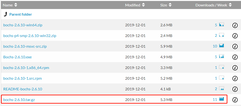 1.官方下载地址,选择对应的版本进行下载,下载2.6.10版本(bochs-2.6.10.tar.gz)。