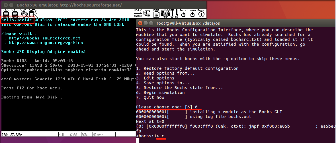 $ // boot.bin 换成编译后对应的机器码文件目录 $ dd if=boot.bin of=c.img bs=512 count=1 conv=notrunc 1+0 records in 1+0 records out 512 bytes (512 B) copied, 5.6586e-05 s, 9.0 MB/s