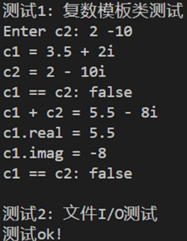#include "Complex.hpp" #include <iostream> #include <fstream> #include <stdexcept> void test1(); void test2(); int main() { using namespace std; cout << "测试1: 复数模板类测试" << endl; test1(); cout << "\n测试2: 文件I/O测试" << endl; test2(); } void test1() { using namespace std; Complex<double> c1{3.5, 2}, c2; cout << "Enter c2: "; cin >> c2; cout << "c1 = " << c1 << endl; cout << "c2 = " << c2 << endl; cout << "c1 == c2: " << boolalpha << (c1 == c2) << endl; cout << "c1 + c2 = " << c1 + c2 << endl; c1 += c2; cout << "c1.real = " << c1.get_real() << endl; cout << "c1.imag = " << c1.get_imag() << endl; cout << "c1 == c2: " << boolalpha << (c1 == c2) << endl; } void test2() { using namespace std; Complex<int> c1{1, 2}, c2{9, -7}; ofstream out("ans.txt"); if(!out.is_open()) { cout << "fail to open file ans.txt to write\n"; return; } out << "c1 = " << c1 << endl; out << "c2 = " << c2 << endl; out << "c1 + c2 = " << c1 + c2 << endl; out << "(c1 == c2) = " << boolalpha << (c1 == c2) << endl; out.close(); cout << "测试ok!" << endl; }