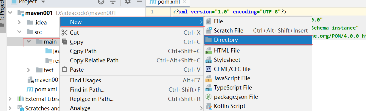 5:如果main文件下没有java文件夹和resources文件夹,那么需要新建一个: