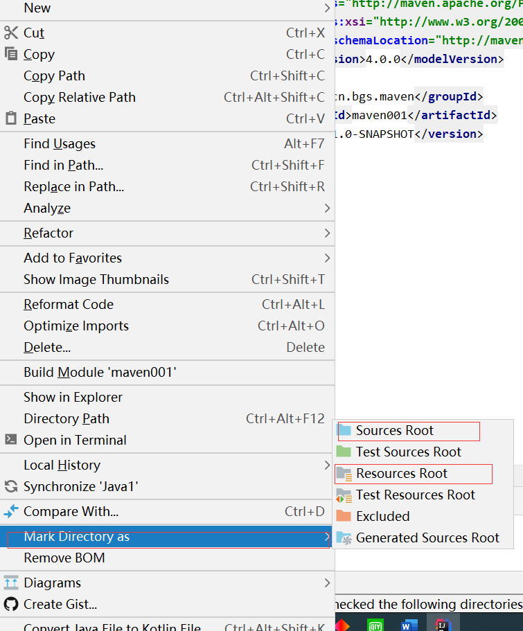 Java文件夹选择蓝色的,resources文件夹选择带四条黄横杠的