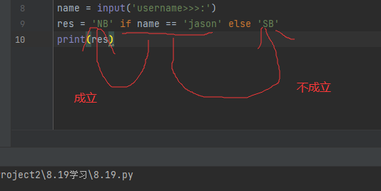 #当if判断仅仅是二选一的情况下 可以用三元表达式 name = input('username>>>:') res = 'NB' if name == 'jason' else 'SB' print(res) 当if后面的条件成立的情况下,使用前面的结果,当if的结果不成立的情况下 使用后面的结果,由中间if 的条件做判断