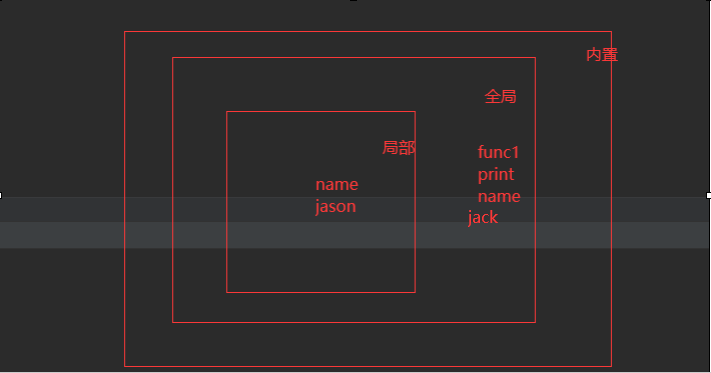 name = 'jack' # 在全局名称空间 def func1(): name = 'jason'# 由于运行顺序是从局部名称开始所以先找到函数内部的以name为变量名的'jason' print(name) # 由于已经在局部名称空间找到了jason所以上面的jack就不会再取值 func1() # 所以运行结果是jason
