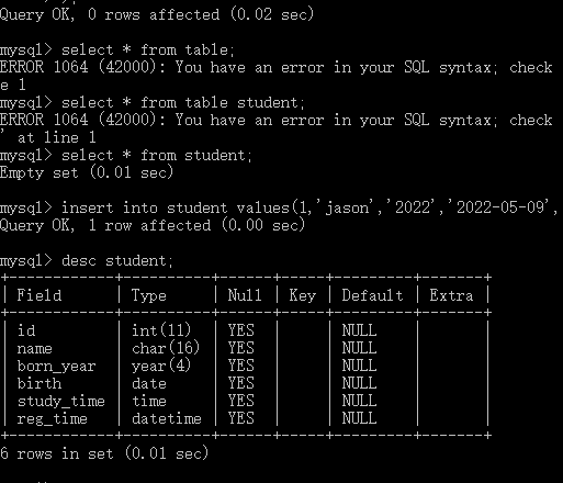 insert into student values(1,'jason','2022','2022-05-09','11:11:00','2022-11-11 11:11:11');