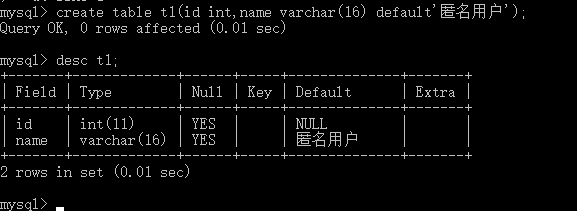 默认值的类型要前后一致.int 要对应数字,varchar 对应字符串