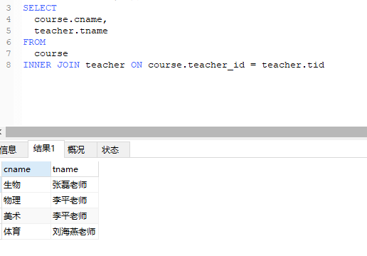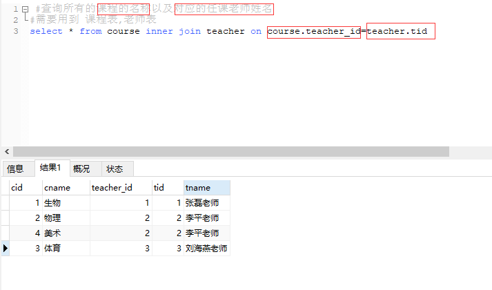 1、查询所有的课程的名称以及对应的任课老师姓名