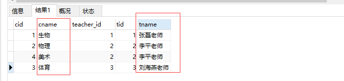 然后在根据题目意思 把获取到的数据表格看做一张新的数据表 ,从中获取想要的 课程名和老师名