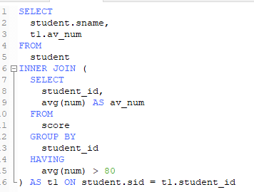 select * from student inner join(select student_id,avg(num) as av_num from score group by student_id having avg(num)>80) as t1 on student.sid=t1.student_id