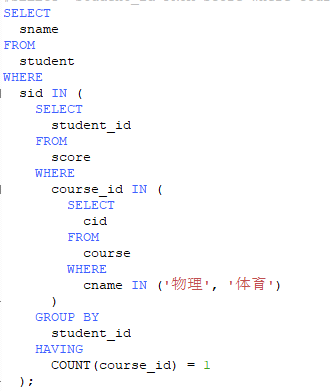 SELECT student_id FROM score where course_id in (select cid from course where cname in('物理','体育')) GROUP BY student_id having COUNT(course_id)=1