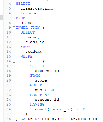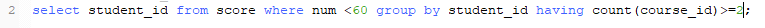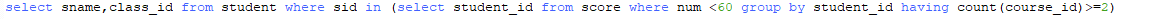 5. 查询挂科超过两门(包括两门)的学生姓名和班级