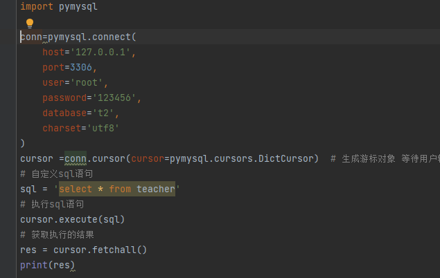 import pymysql # 创建连接对象 conn = pymysql.connect( host='127.0.0.1', port=3306, user='root', password='123456', database='t2', charset='utf8' ) cursor = conn.cursor(cursor=pymysql.cursors.DictCursor #固定搭配 可以显示每一个数据对应的内容并且以列表套字典的形式打包返回方便以后for 取值) # 生成游标对象 等待用户输入命令 # 自定义sql语句 sql = 'select * from teacher' # 执行sql语句 cursor.execute(sql) # 获取执行的结果 res = cursor.fetchall() print(res)