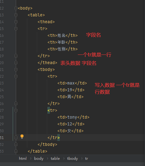 <table> <thead> <tr> <th>姓名</th> <th>年龄</th> <th>性别</th> </tr> </thead> <tbody> <tr> <td>max</td> <td>19</td> <td>男</td> </tr> </tbody> </table>