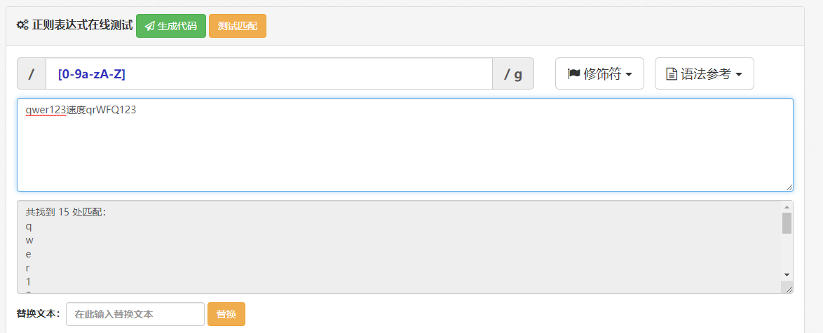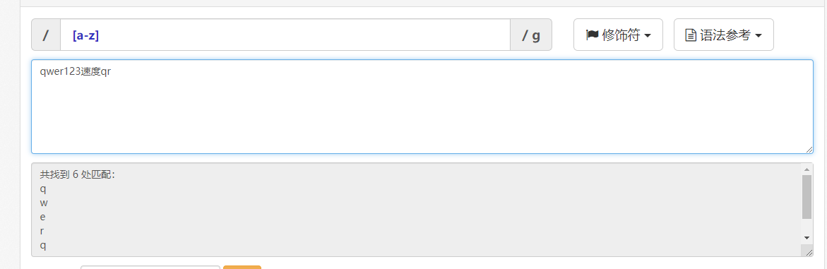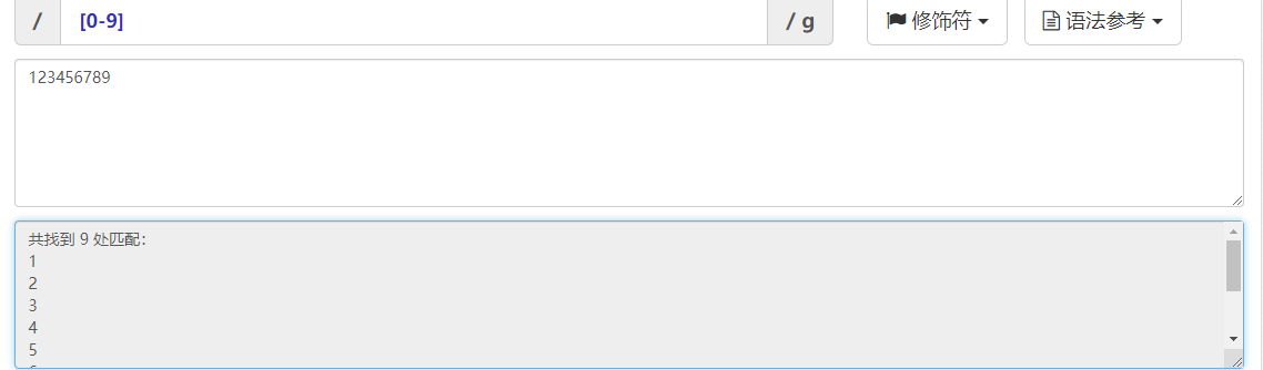 [0123456789] 匹配0到9之间的任意一个数字包括首尾 [0-9] 简写:匹配0到9之间的任意一个数字包括首尾 [a-z] 匹配小写字母a到z之间的任意一个字母包括首尾 [A-Z] 匹配大写字母A到Z之间的任意一个字母包括首尾 [0-9a-zA-Z] 匹配数字或者小写字母或者大写字母