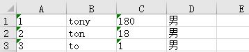 wb1.append([1,'tony',180,'男']) wb1.append([2,'ton',18,'男']) wb1.append([3,'to',1,'男'])
