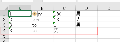 wb1.append([1,'tony',180,'男']) wb1.append([2,'ton',18,'男']) wb1.append([3,'to',1,'男']) wb1.append([3,'to',None,'男'])