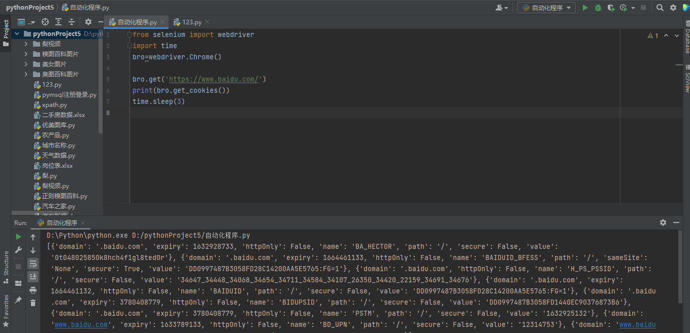 from selenium import webdriver import time bro=webdriver.Chrome() bro.get('https://www.baidu.com/') print(bro.get_cookies()) time.sleep(3)