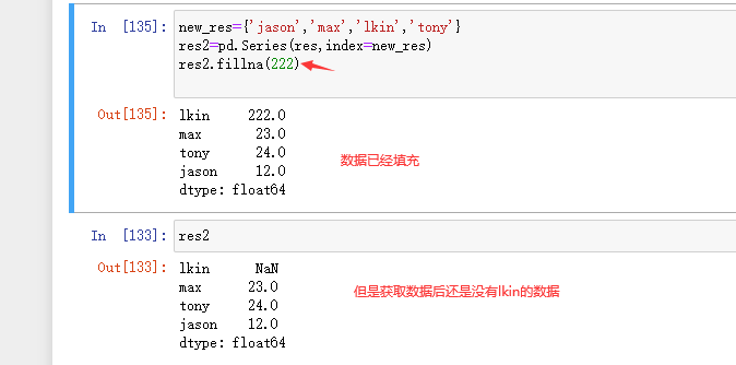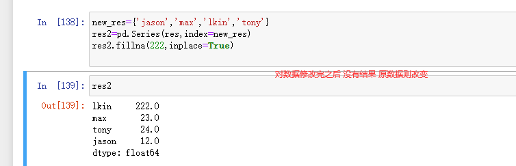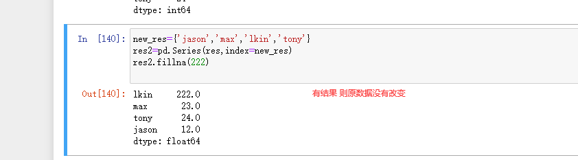 """ 如何判断当前数据是否改变 1.如果执行操作之后有结果说明原数据没有变 res.fillna(666) 2.如果执行操作之后没有结果说明原数据改变 res.fillna(666,inplace=True) inplace=True该参数很多方法都有 意思就是直接改变原数据 """