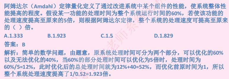 某组件采用某种更快的执行方式,所获得的系统性能的改变程度,取决于该组件被使用的频率,或所占总执行时间的比例,加速比公式: