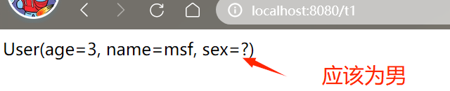 1 @Controller 2 public class UserCon { 3 @RequestMapping("/t1") 4 @ResponseBody //这个注解会不依靠视图解析器,此方法就会返回一个字符串 5 public String test1() throws JsonProcessingException { 6 User user = new User(3, "msf", "男"); 7 ObjectMapper mapper = new ObjectMapper(); 8 String value = mapper.writeValueAsString(user); 9 return value; 10 } 11 }