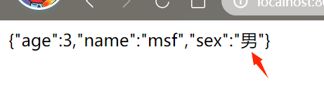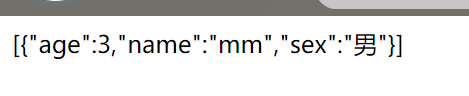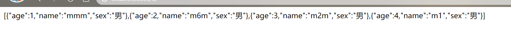 1 @RequestMapping("/t4") 2 public String test3(){ 3 User user = new User(3, "mm", "男"); 4 List<User> users = new ArrayList<User>(); 5 users.add(user); 6 String user1 = JSON.toJSONString(users); 7 return user1; 8 }