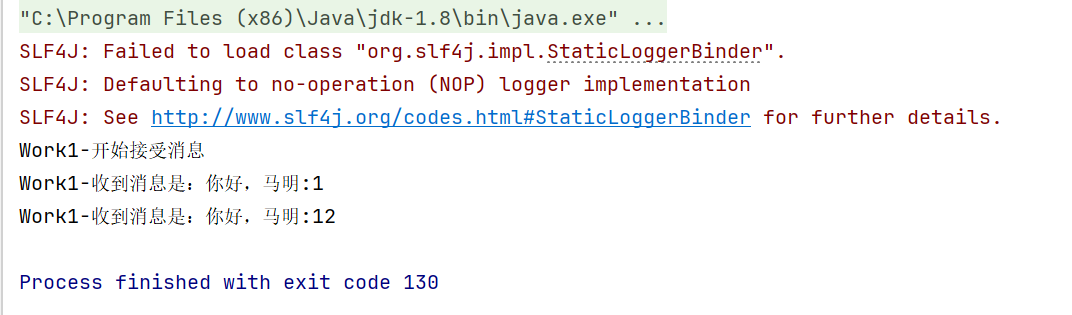 import com.rabbitmq.client.*; import java.io.IOException; public class Work1 { public static void main(String[] args) { // 1: 创建连接工厂 ConnectionFactory connectionFactory = new ConnectionFactory(); // 2: 设置连接属性 connectionFactory.setHost("8.137.76.12"); connectionFactory.setPort(5672); connectionFactory.setVirtualHost("/"); connectionFactory.setUsername("admin"); connectionFactory.setPassword("admin"); Connection connection = null; Channel channel = null; try { // 3: 从连接工厂中获取连接 connection = connectionFactory.newConnection("消费者-Work1"); // 4: 从连接中获取通道channel channel = connection.createChannel(); // 5: 申明队列queue存储消息 /* * 如果队列不存在,则会创建 * Rabbitmq不允许创建两个相同的队列名称,否则会报错。 * * @params1: queue 队列的名称 * @params2: durable 队列是否持久化 * @params3: exclusive 是否排他,即是否私有的,如果为true,会对当前队列加锁,其他的通道不能访问,并且连接自动关闭 * @params4: autoDelete 是否自动删除,当最后一个消费者断开连接之后是否自动删除消息。 * @params5: arguments 可以设置队列附加参数,设置队列的有效期,消息的最大长度,队列的消息生命周期等等。 * */ // 这里如果queue已经被创建过一次了,可以不需要定义 // channel.queueDeclare("queue1", false, false, false, null); // 同一时刻,服务器只会推送一条消息给消费者 // 6: 定义接受消息的回调 Channel finalChannel = channel; finalChannel.basicQos(1); finalChannel.basicConsume("queue1", true, new DeliverCallback() { @Override public void handle(String s, Delivery delivery) throws IOException { try{ System.out.println("Work1-收到消息是:" + new String(delivery.getBody(), "UTF-8")); Thread.sleep(2000); }catch(Exception ex){ ex.printStackTrace(); } } }, new CancelCallback() { @Override public void handle(String s) throws IOException { } }); System.out.println("Work1-开始接受消息"); System.in.read(); } catch (Exception ex) { ex.printStackTrace(); System.out.println("发送消息出现异常..."); } finally { // 7: 释放连接关闭通道 if (channel != null && channel.isOpen()) { try { channel.close(); } catch (Exception ex) { ex.printStackTrace(); } } if (connection != null && connection.isOpen()) { try { connection.close(); } catch (Exception ex) { ex.printStackTrace(); } } } } }