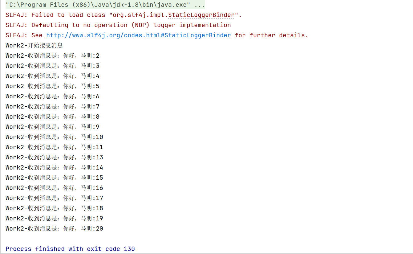 import com.rabbitmq.client.*; import java.io.IOException; public class Work2 { public static void main(String[] args) { // 1: 创建连接工厂 ConnectionFactory connectionFactory = new ConnectionFactory(); // 2: 设置连接属性 connectionFactory.setHost("8.137.76.12"); connectionFactory.setPort(5672); connectionFactory.setVirtualHost("/"); connectionFactory.setUsername("admin"); connectionFactory.setPassword("admin"); Connection connection = null; Channel channel = null; try { // 3: 从连接工厂中获取连接 connection = connectionFactory.newConnection("消费者-Work2"); // 4: 从连接中获取通道channel channel = connection.createChannel(); // 5: 申明队列queue存储消息 /* * 如果队列不存在,则会创建 * Rabbitmq不允许创建两个相同的队列名称,否则会报错。 * * @params1: queue 队列的名称 * @params2: durable 队列是否持久化 * @params3: exclusive 是否排他,即是否私有的,如果为true,会对当前队列加锁,其他的通道不能访问,并且连接自动关闭 * @params4: autoDelete 是否自动删除,当最后一个消费者断开连接之后是否自动删除消息。 * @params5: arguments 可以设置队列附加参数,设置队列的有效期,消息的最大长度,队列的消息生命周期等等。 * */ // 这里如果queue已经被创建过一次了,可以不需要定义 //channel.queueDeclare("queue1", false, true, false, null); // 同一时刻,服务器只会推送一条消息给消费者 //channel.basicQos(1); // 6: 定义接受消息的回调 Channel finalChannel = channel; finalChannel.basicQos(1); finalChannel.basicConsume("queue1", true, new DeliverCallback() { @Override public void handle(String s, Delivery delivery) throws IOException { try{ System.out.println("Work2-收到消息是:" + new String(delivery.getBody(), "UTF-8")); Thread.sleep(200); }catch(Exception ex){ ex.printStackTrace(); } } }, new CancelCallback() { @Override public void handle(String s) throws IOException { } }); System.out.println("Work2-开始接受消息"); System.in.read(); } catch (Exception ex) { ex.printStackTrace(); System.out.println("发送消息出现异常..."); } finally { // 7: 释放连接关闭通道 if (channel != null && channel.isOpen()) { try { channel.close(); } catch (Exception ex) { ex.printStackTrace(); } } if (connection != null && connection.isOpen()) { try { connection.close(); } catch (Exception ex) { ex.printStackTrace(); } } } } }