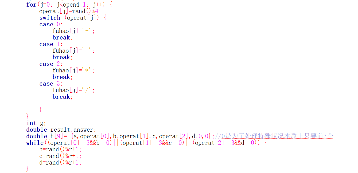2.我用3个元素的数组定义了符号位,每个元素范围是0到3,数字代替算术运算符(补充:为防止出现/号后面有0的情况我做了一个循环),最后我定义了一个数组(也就是你看到的h数组),他长这样(元素,运算符,元素,运算符,元素,运算符,元素,0,0)(后面的0,0,与算法无关只是为了改进一个特殊情况,将在下文说明)