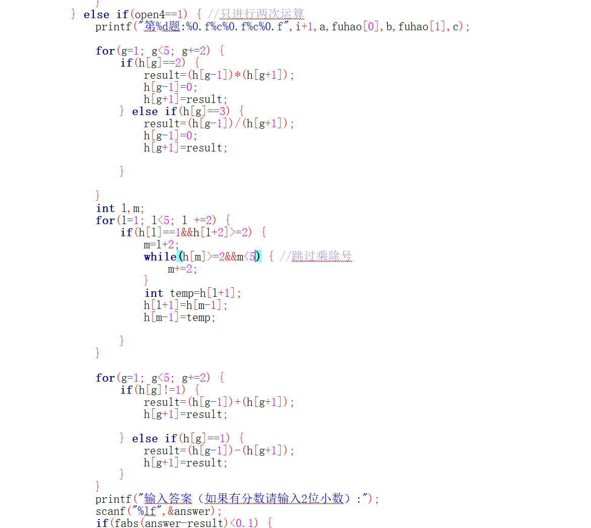 4.第一步算乘除:首先打印题目让玩家可以计算answer,并且先找到2元运算符*,/;在让符号两边的元素进行相应的计算;算完后让前一个数为0后一个数为这次计算的答案(我在第三步算加减时是从左往右计算的,把不是减法的都加起来);接着找下一个2元运算符。(我有个表达错误,我们最后的答案不是这个result,而是计算完第二三步后的result的,你可以用temp代替这里的result,但是这个表达错误不影响结果(所以我不改正))