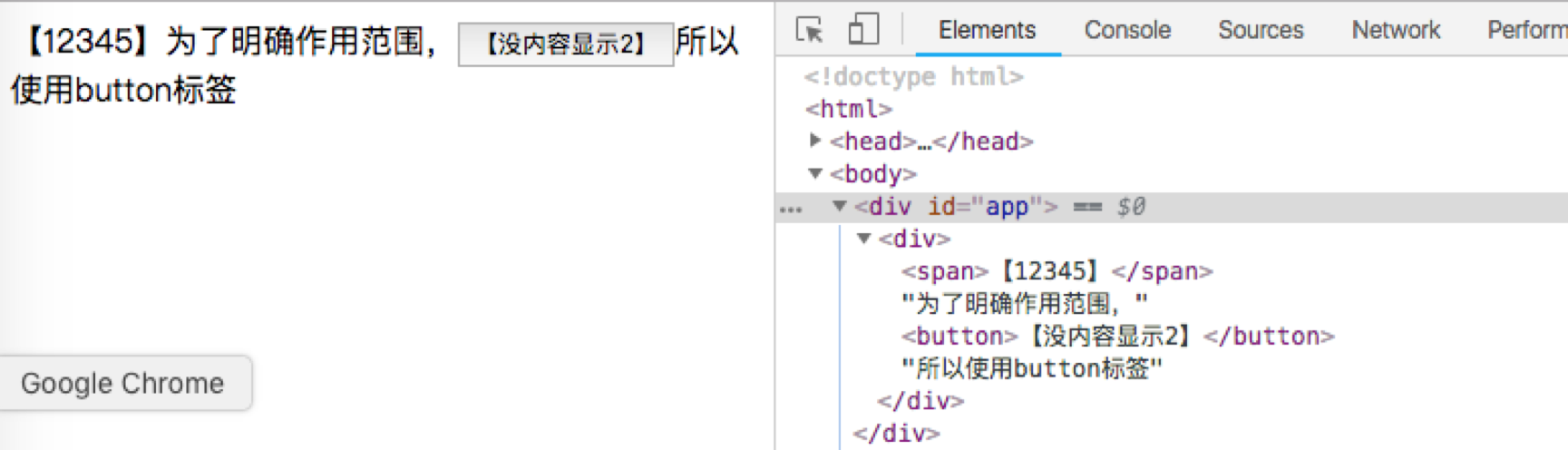 <div class="" id="app"> <children> <span>我是slot内容</span> <!--这行不会显示--> </children> </div> <script type="text/javascript"> new Vue({ el: "#app", data: { }, components: { children: { //这个无返回值,不会继续派发 template: "<button>为了明确作用范围,所以使用button标签</button>" } } }) </script>