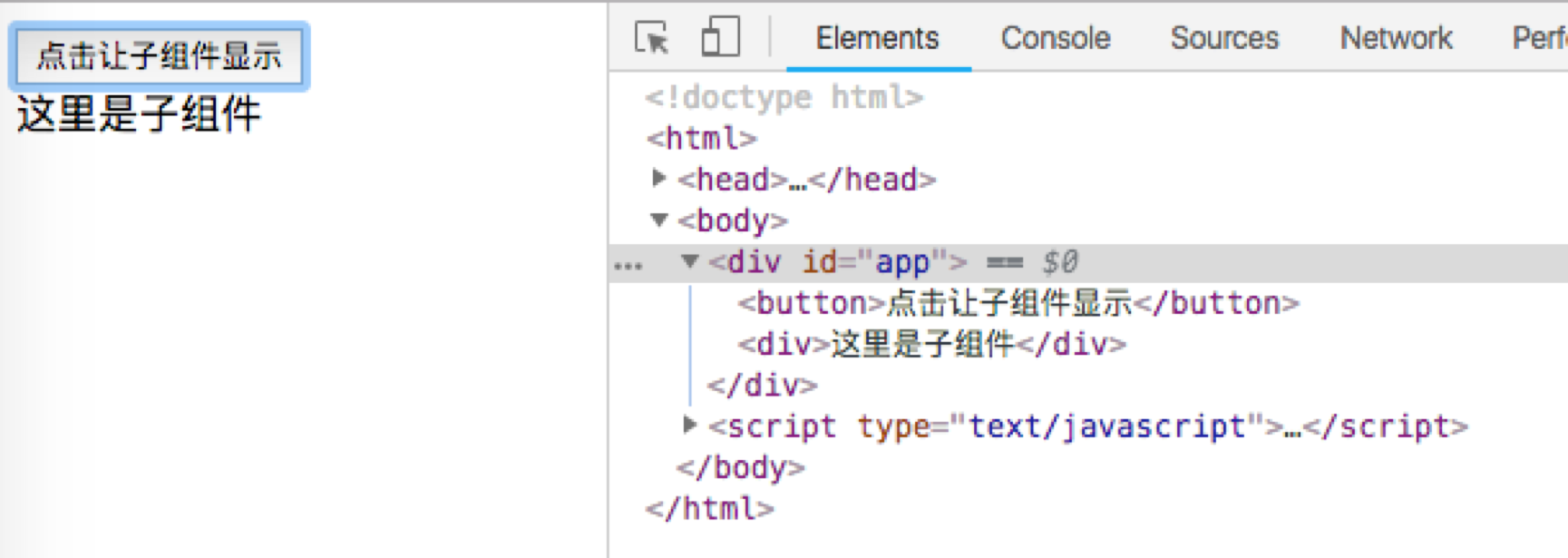 说明: a、name=”first”的slot标签被父组件对应的标签所替换(slot标签内部的内容被舍弃) b、name=”last”的slot标签,因为没有对应内容,则显示该slot标签内部的内容。 G、假如想控制子组件根标签的属性 【1】首先,由于模板标签是属于父组件的,因此,将子组件的指令绑定在模板标签里,是不可以的(因为其归属于父组件) 【2】假如需要通过父组件控制子组件是否显示(例如v-show或v-if),那么这个指令显然是属于父组件的,可以将标签写在子组件的模板上。例如: <div class="" id="app"> <button @click="toshow">点击让子组件显示</button> <children v-if="abc"></children> </div> <script type="text/javascript"> new Vue({ el: "#app", data: { abc: false }, methods: { toshow: function() { this.abc = !this.abc; } }, components: { children: { //这个无返回值,不会继续派发 template: "<div>这里是子组件</div>" } } }) </script>