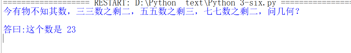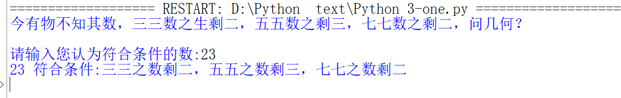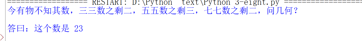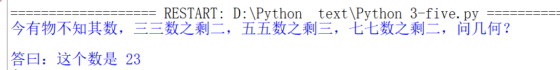 rint("今有物不知其数,三三数之剩二,五五数之剩三,七七数之剩二,问几何?\n")