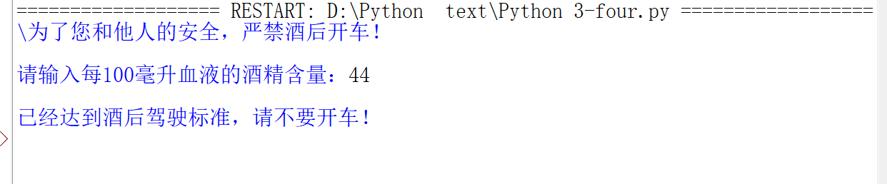 print("\n已经达到酒后驾驶标准,请不要开车!")