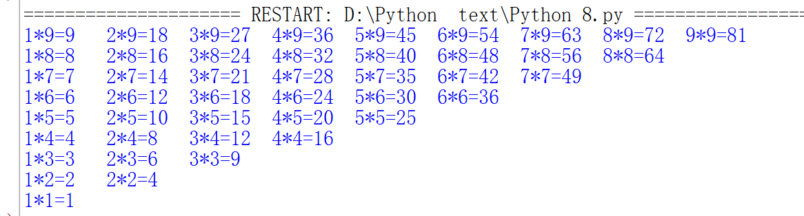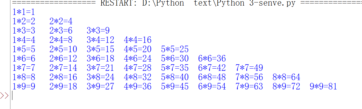 print(str(j) + "*" + str(i) + "=" + str(i * j) + "\t",end='')