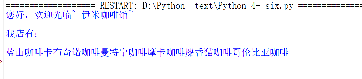 print("您好,欢迎光临~ 伊米咖啡馆~ \n\n我店有: \n")