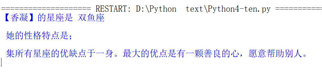 print("\n 她的性格特点是;\n\n",sign_dict.get(person_dict.get("香凝")))