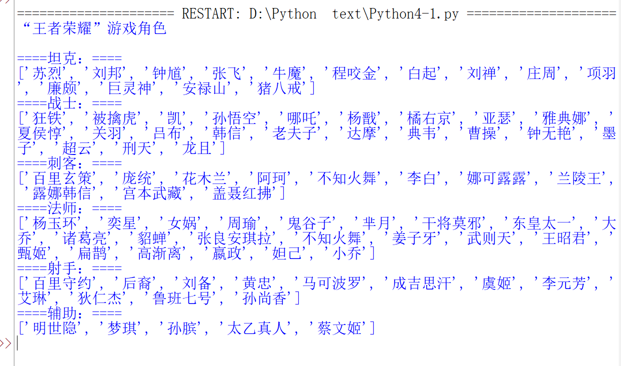 role = ["====坦克:====","====战士:====","====刺客:====","====法师:====","====射手:====","====辅助:===="]