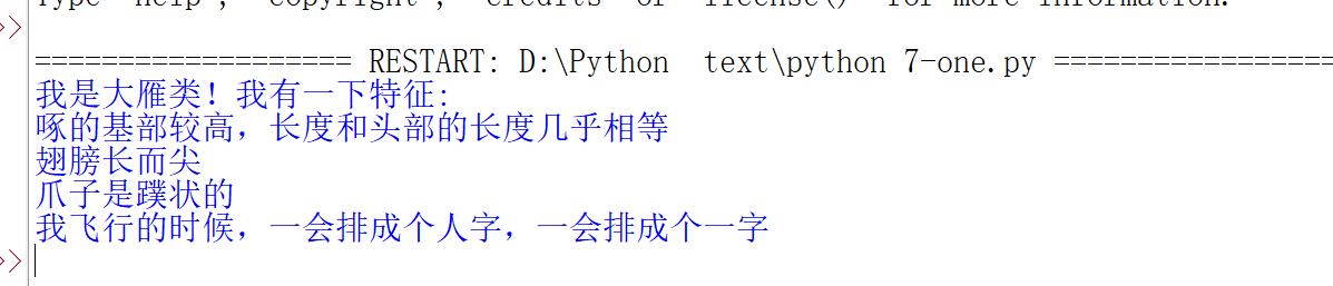 print("我是大雁类!我有一下特征:")