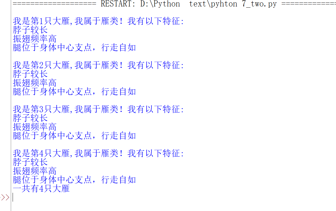 print("\n我是第" + str(Geese.number) + "只大雁,我属于雁类!我有以下特征:")