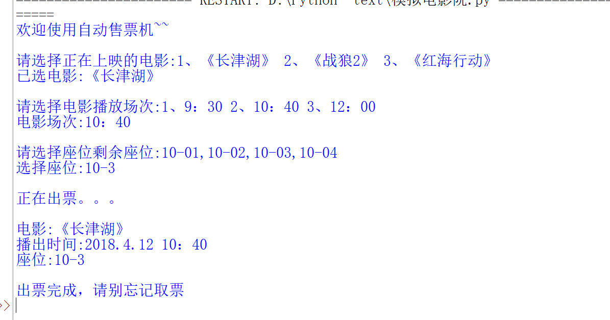 print("\n请选择电影播放场次:1、9:30 2、10:40 3、12:00")