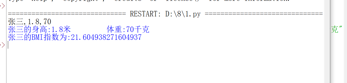 print(person + "的身高:" + str(height) + "米\t 体重:" + str(weight) + "千克")