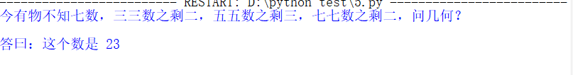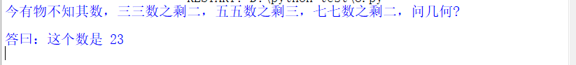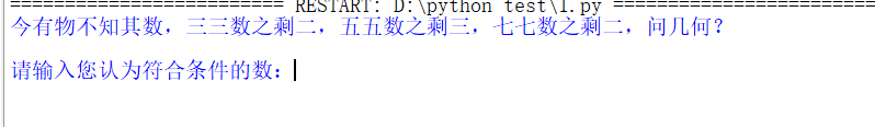 rint("今有物不知其数,三三数之剩二,五五数之剩三,七七数之剩二,问几何?\n")
